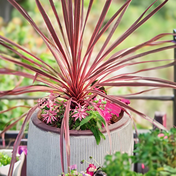 Cordyline 'Charlie Boy' je ako socha tropickej krásy – jej dlhé mečovité listy v odtieňoch bordovej, bronzovej a jasnej ružovej z nej robia neprehliadnuteľnú dominantu každej výsadby. Táto elegantná rastlina s palmovitým habitusom vnáša do záhrady šťavu a odvahu – je ideálna ako solitér alebo súčasť moderných kompozícií.