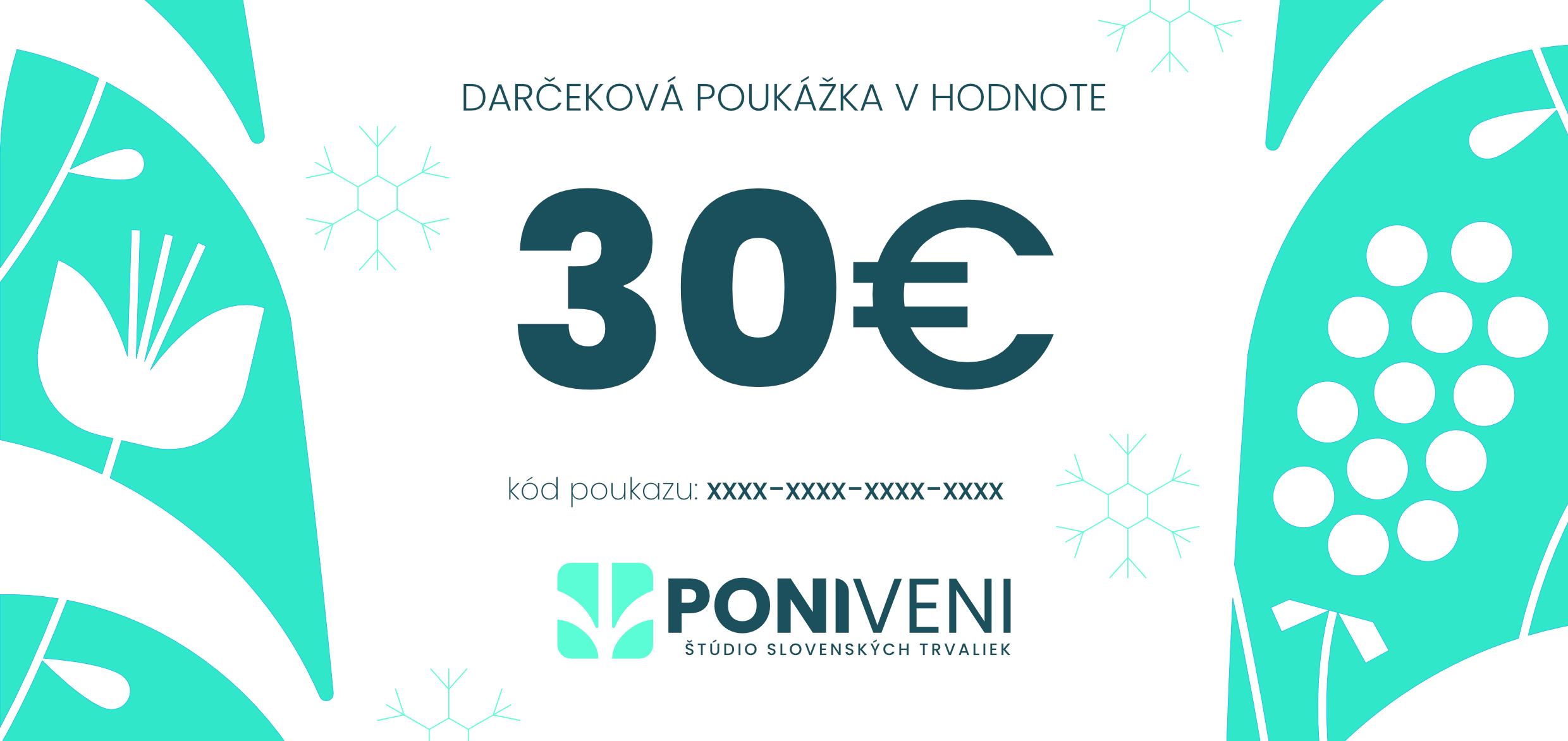 Radi nakupujete rastliny v našom e-shope, alebo poznáte niekoho kto zdieľa rovnaké nadšenie? Pripravili sme pre vás rýchly a jednoduchý darček. Poukaz v hodnote 30 eur má platnosť 1 rok od vystavenia. Môžete použiť na nákup ľubovoľných rastlín v internetovom obchode www.slovensketrvalky.sk