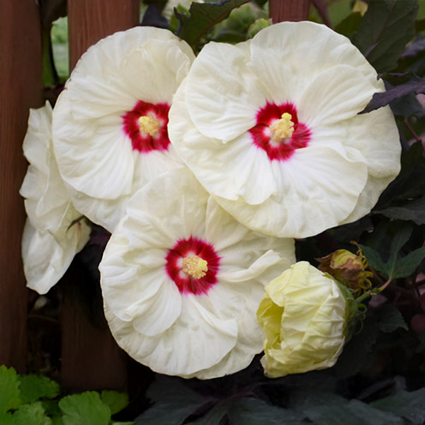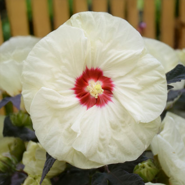 Hibiscus moscheutos ‘French Vanilla’ je ako letný závan francúzskej elegancie v záhrade. Jeho jemne krémové, vanilkové kvety s kontrastným tmavobordovým očkom pôsobia až étericky. Obrovské kvety, veľké 20–25 cm, vyžarujú jemnosť a noblesu – a to celé leto, od júla až do septembra.