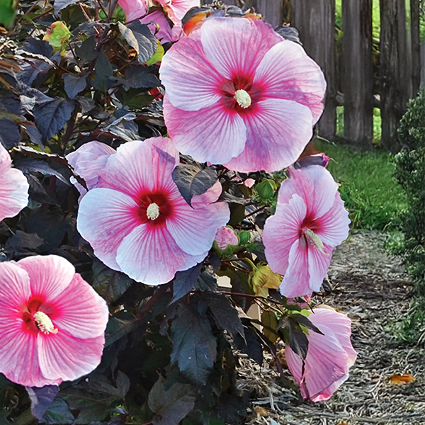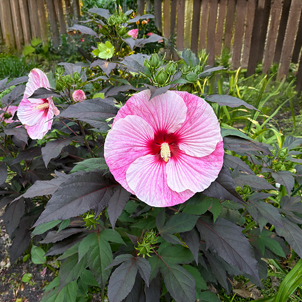 Hibiscus moscheutos ‘Starry Night’ je ako hviezdna noc uprostred leta. Jeho tmavé, bordovo sfarbené listy pripomínajú zamatové plátno, na ktorom žiaria jemne ružové kvety s výrazným vínovým očkom. Každý kvet dosahuje priemer 20–25 cm a pôsobí ako umelecký akcent, ktorý okamžite upúta pozornosť.