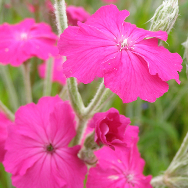 Lychnis ‘Hill Grounds’ je pôvabná novinka v sortimente, ktorá spája striebristý vzhľad s pestrým kvitnutím. Tvoria ju husté rozetky jemne šedo-strieborného, plsteného lístia, z ktorých už začiatkom mája vyrážajú čipkované výhonky nesúce súkvetia magentovej farby kvetov. Kvety sa objavujú v otvorených špirálach a rozkvitania trvá až do leta – ideálna voľba pre tých, ktorí milujú farbu bez neporiadku z vysiatych semienok.