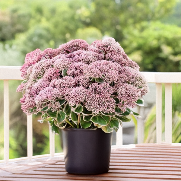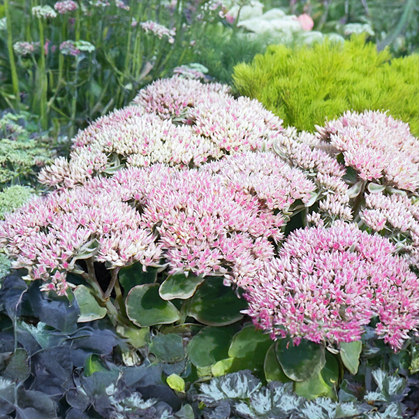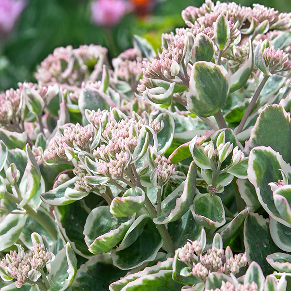 Pestrolistý, kompaktný rozchodník s ružovými súkvetiami.