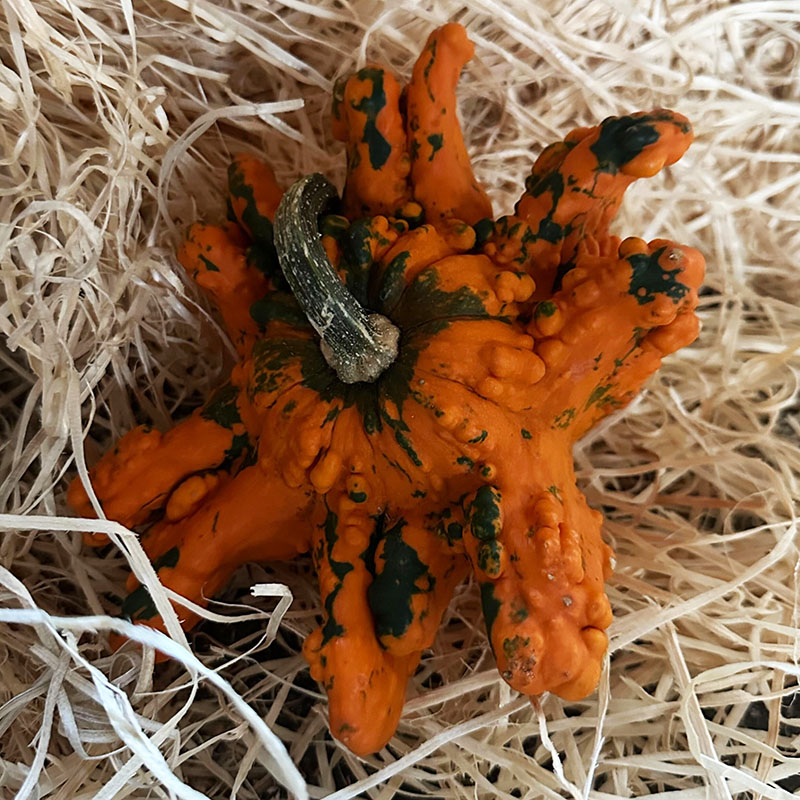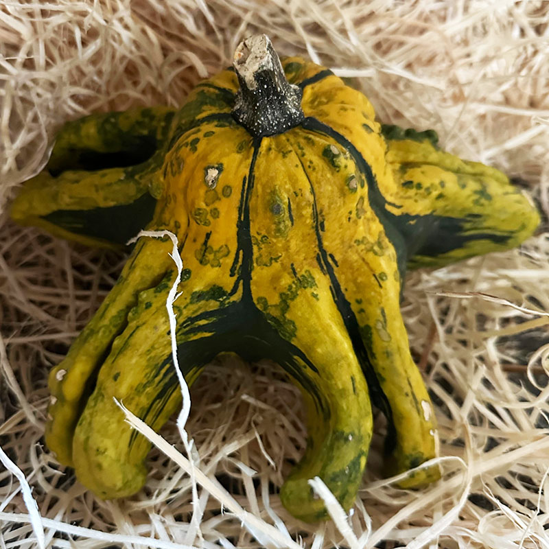 Keď chceš jesennému dekoru dodať šmrnc, siahni po hviezdicovej tekvici. Nepravidelné „prsty“ a jemne bradavičnatý povrch robia z každého plodu malú sochu prírody. Vynikne samostatne na podnose so sviečkami, vo venčeku na dverách, aj ako akcent v kaviarenských a obchodných výkladoch. Farebný mix oranžovej a žlto-zelenej s tmavozelenými škvrnami prinesie energiu aj hravosť – presne to, čo jeseň miluje.