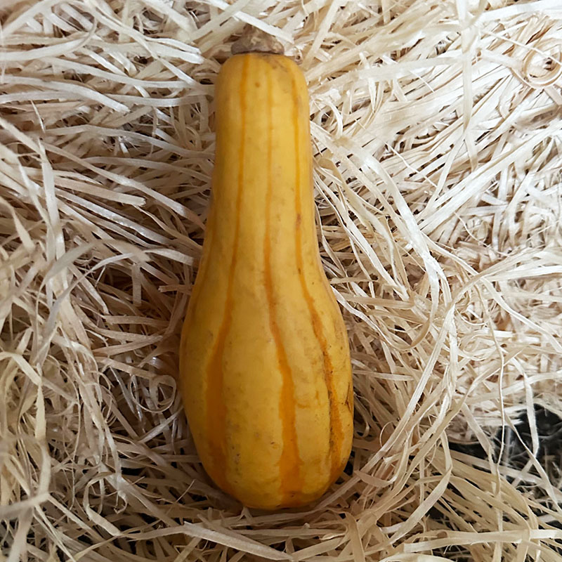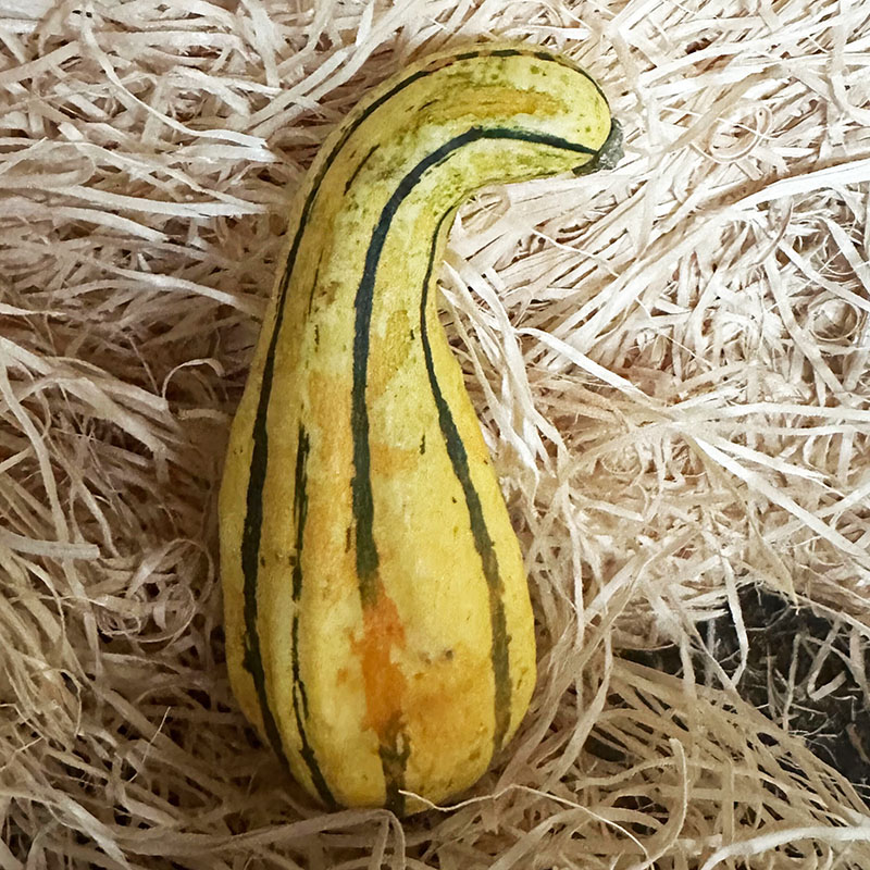 Štíhle tekvičky v tvare hrušky a jemne prehnuté „hadíky“ sú ideálne na dotiahnutie jesenných aranžmánov. Ich dlhá, elegantná silueta vytvára pekný kontrast k guľatým tekviciam a v okamihu pridá kompozícii rytmus. Dostaneš prirodzený mix odtieňov – žlté, smotanové až žlto-zelené kusy so zvislými pruhmi či jemným škvrnením. Každý plod je jedinečný prírodný originál a spolu pôsobia hravo, no stále vkusne.