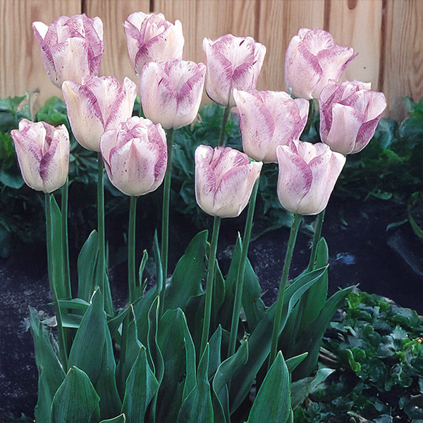 Tulipán 'Shirley' je očarujúci Triumph tulipán, ktorý patrí medzi skutočné skvosty jarnej záhrady. Jeho kvety sú spočiatku čistobiele až jemne krémové, postupne sa menia na svetloružové a konce okvetných lístkov zvýrazňuje tenký purpurový lem. Tento jemný prechod farieb vytvára efekt živej premeny - každý deň sa kvet javí trochu inak.
